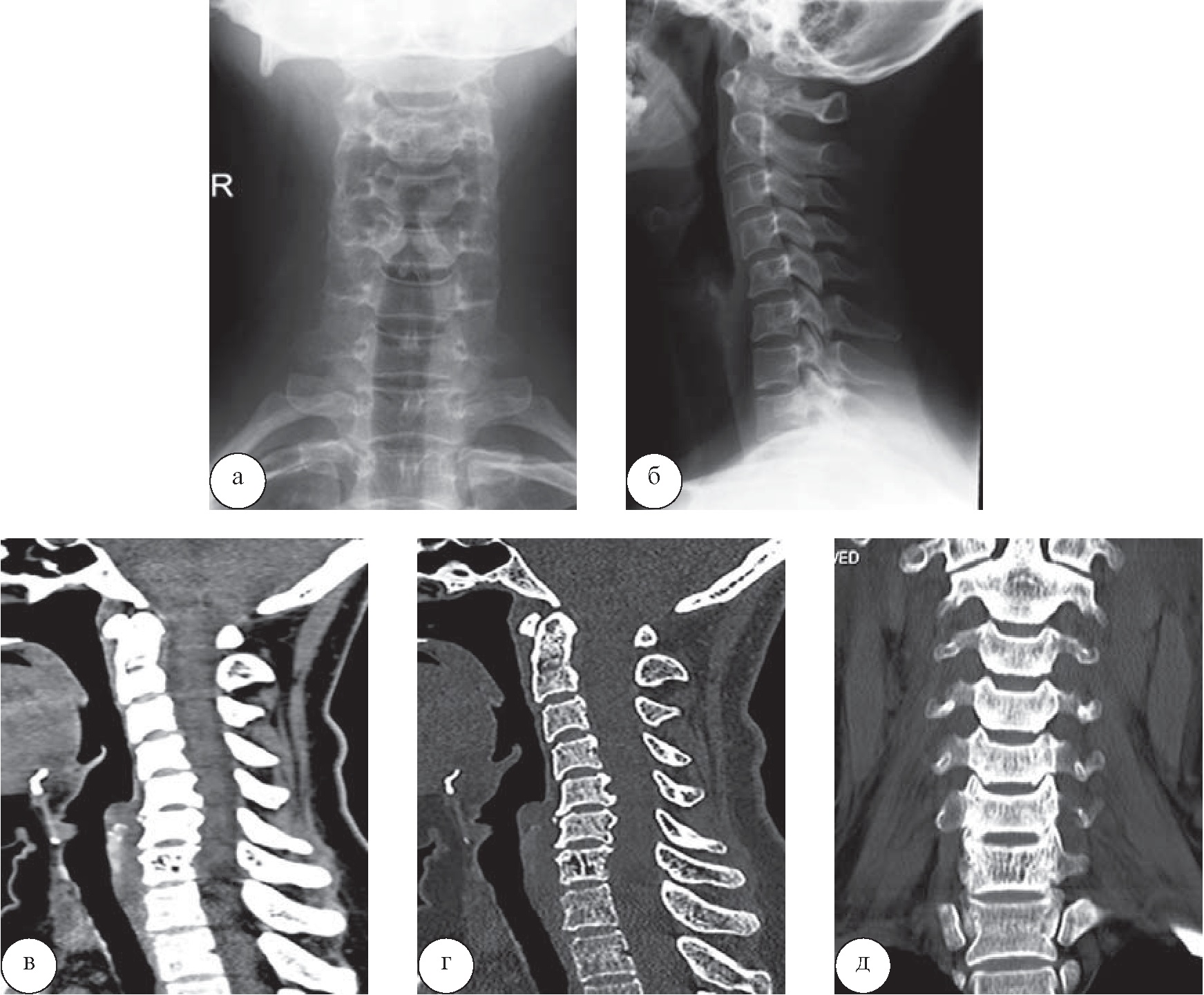 Рис. 4. Пациентка К., 56 лет. Рентенограммы шейного отдела позвоночника: а – прямая, б – боковая проекции. Определяются умеренные проявления остеохондроза шейного отдела позвоночника, остеоартроза унковертебральных сочленений. На КТ в сагиттальной (в, г) и корональной (д) плоскостях определяется остеохондроз шейного отдела позвоночника, протрузий межпозвонковых дисков С2–3, С3–4, С4–5, экструзии межпозвонковых дисков С5–6, С6–7, спондилоартроз, гемангиома тела позвонка С7