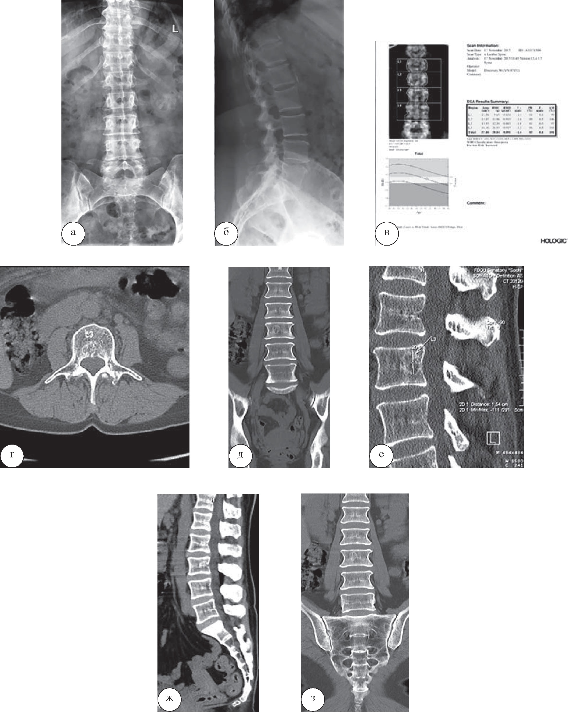Рис. 5. Пациент Д., 60 лет. При рентенографии пояснично-крестцового отдела позвоночника в прямой и боковой проекциях (а, б) определяются умеренные проявления остеохондроза поясничного отдела позвоночника, спондилоартроза. При остеоденситометрии (в) площадь сканируемой поверхности составила 57,04 см2, содержание костного минерала (BMC) – 50,84 г, проекционная минеральная плотность костной ткани (BMD) – 0,891 г/см2, Т-критерий = –1,4, Z-критерий = 0,1; минерализация костей поясничного отдела позвоночника – в пределах значений остеопении. На КТ в аксиальной (г), фронтальной (д, ж), сагиттальных (е, з) плоскостях определяются умеренные проявления остеохондроза поясничного отдела позвоночника, протрузии межпозвонкового диска L3–4, экструзии межпозвонкового диска L5–S1, гемангиома тела позвонка L3