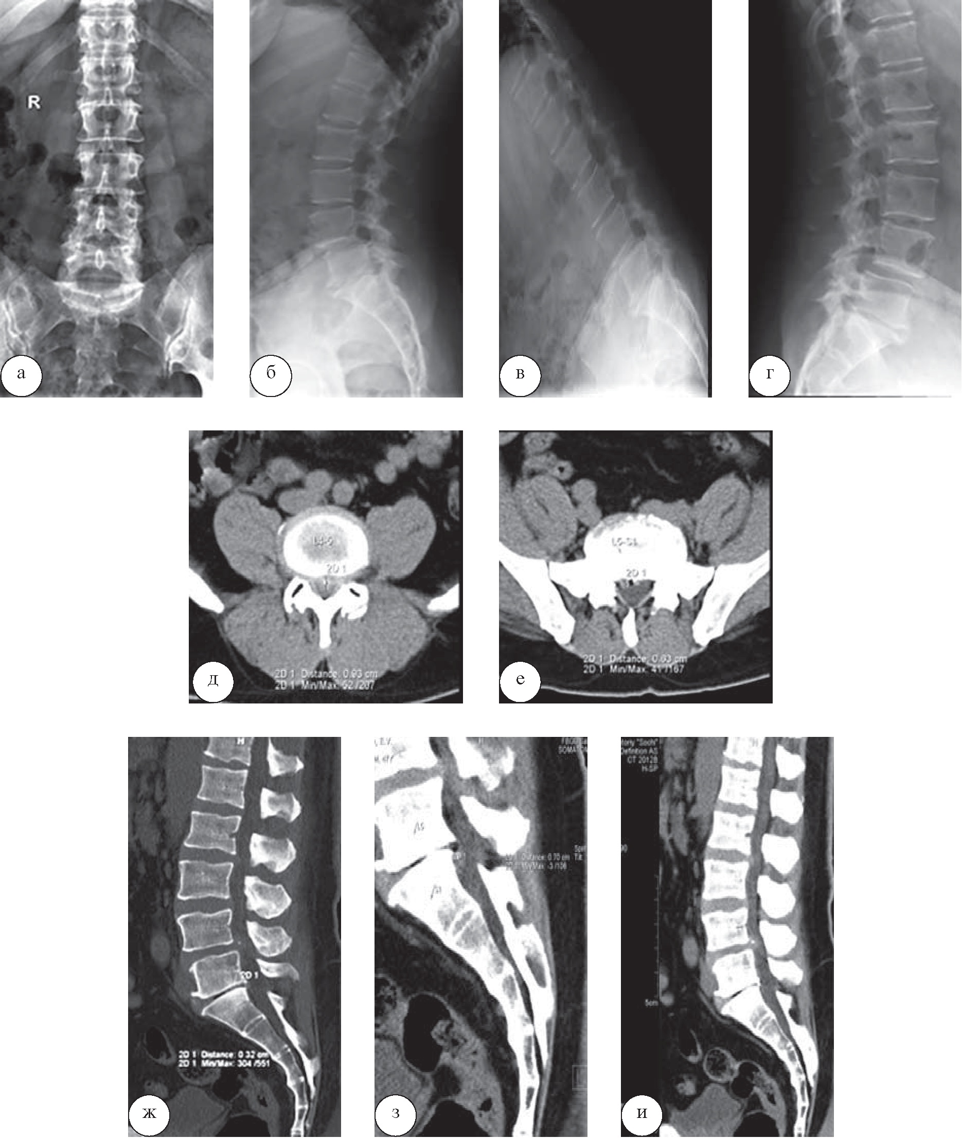 Рис. 7. Пациент Р., 47 лет. При рентенографии пояснично-крестцового отдела позвоночника в прямой и боковой проекциях (а, б) и выполнении функциональных проб (сгибание (в) и разгибание (г)) определяются проявления остеохондроза поясничного отдела позвоночника, спондилоартроза, переднего дегенеративного спондилолистеза позвонка L4 1 степени. На компьютерных томограммах в аксиальной (д, е) и сагиттальной (ж–и) плоскостях выявляются задняя грыжа диска L2–3, выступающая до 5 мм, задняя диффузная грыжа межпозвонкового диска L4–5, выступающая до 9 мм и субтотально суживающая просвет позвоночного канала и корешковые отверстия; задняя медиальная частично обызвествившаяся грыжа межпозвонкового диска L5–S1, максимально выступающая до 7 мм на уровне верхней трети тела S1 и распространяющаяся вдоль задней продольной связки. Позвоночный канал на уровне L4–5 сужен грыжей диска и имеет размеры 4×9 мм. Корешковые отверстия L5–S1 сужены за счет остеофитов. Имеются выраженные проявления остеоартроза дугоотростчатых суставов L4–S1. Отмечается передний дегенеративный спондилолистез позвонка L4 до 4 мм, задний дегенеративный спондилолистез позвонка L5 до 3 мм