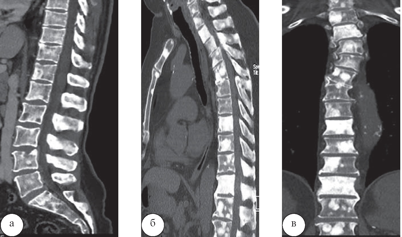Рис. 8. Пациент Т., 67 лет. При КТ отмечаются множественные очаги уплотнения костной структуры в телах всех позвонков, остистых отростках, грудине и рёбрах. В анамнезе – брахитерапия по поводу рака предстательной железы, таким образом, данная картина соответствует остеобластическому метастатическому поражению скелета