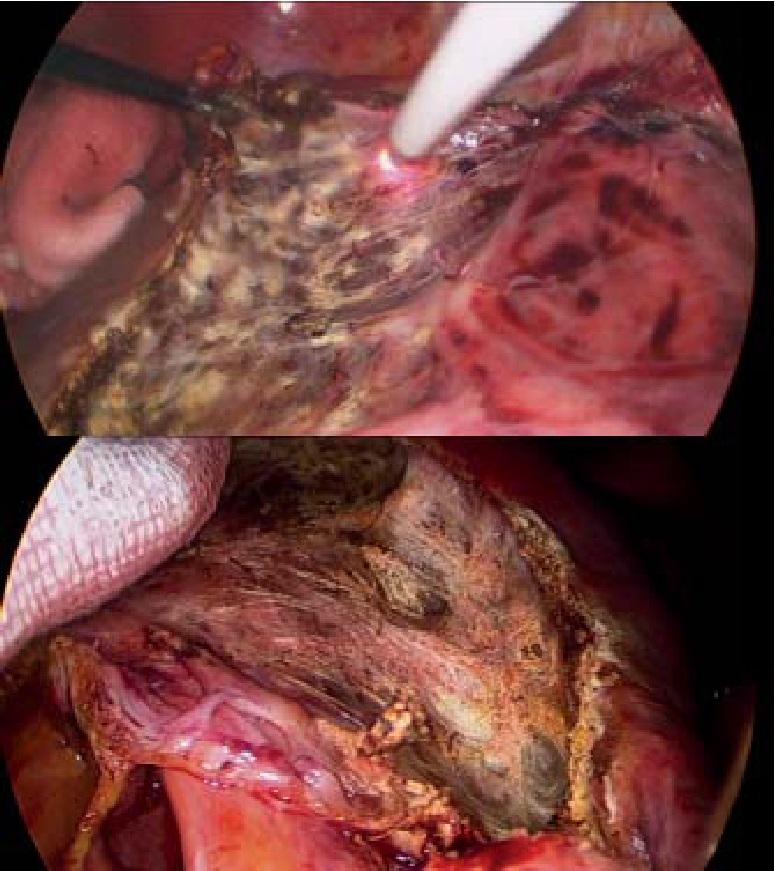 Выполнена пункция кисты печени – получено около 2000 мл прозрачного экссудата. Стенки кисты иссечены с помощью аппарата «LigaSure». Ложе кисты тщательно обработано аргоноплазменной коагуляцией (рис. 3). Аргон под действием электрического поля достаточно легко ионизируется и превращается в плазму, которая направляется в ткани с наименьшим электрическим сопротивлением, вызывая таким образом коагуляцию. Данная методика обработки ложа кисты имеет ряд преимуществ перед обработкой электрокоагуляцией: отсутствие прилипания и минимальная травматизация окружающих тканей, стойкая, но при этом неглубокая (до 3 мм) коагуляция, а также минимальное дымообразование, что очень важно в лапароскопической хирургии. Кроме того, отмечается антимикробное воздействие аргоновой плазмы на обрабатываемую поверхность при бесконтактном использовании [1, 17].
