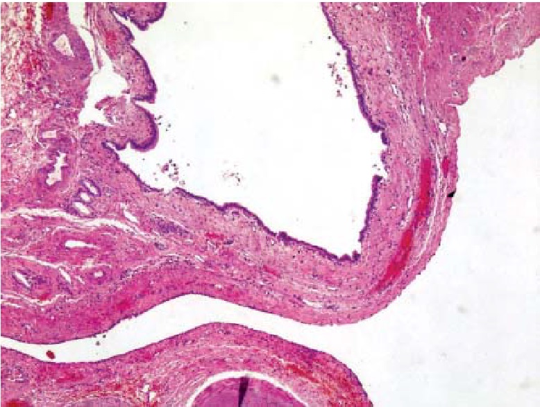 Рис. 4. Гистологическое строение стенки кисты. Окраска гематоксилином и эозином, ув. ×40