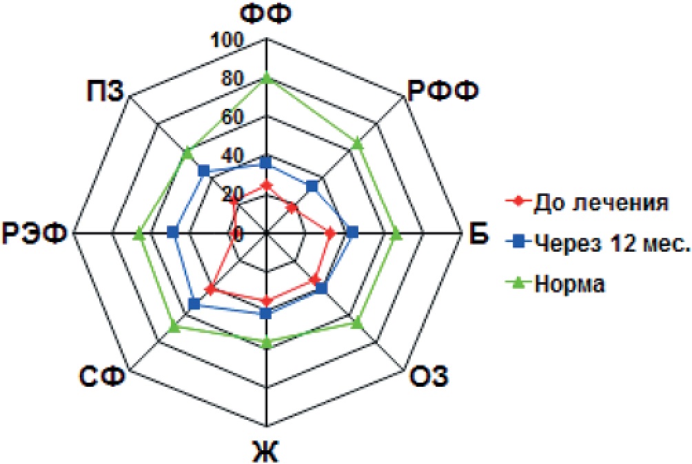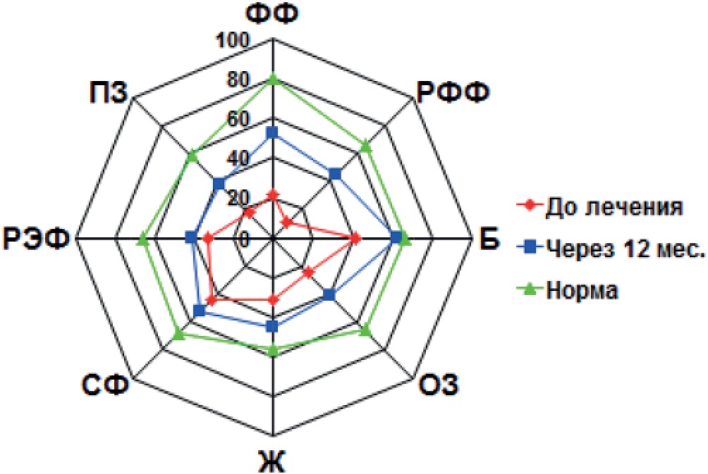 Для оценки эффективности терапии исследовали качество жизни (КЖ) больных РА обеих групп и сравнивали с показателями КЖ здоровых людей с помощью опросника SF-36 [16]. Проводился обязательный подсчет 8 показателей: физическое функционирование (ФФ), ролевое физическое функционирование (РФФ), ролевое эмоциональное функционирование (РЭФ), жизненная активность (Ж), психическое здоровье (ПЗ), социальное функционирование (СФ), боль (Б), общее здоровье (ОЗ). Основные клинико-лабораторные параметры и КЖ определяли до терапии, через 1, 3, 6, 9 и 12 месяцев лечения, при этом контрольные точки определялись до и через 12 месяцев исследования. Протокол исследования одобрен независимым этическим комитетом Военно-медицинской академии имени С.М. Кирова.