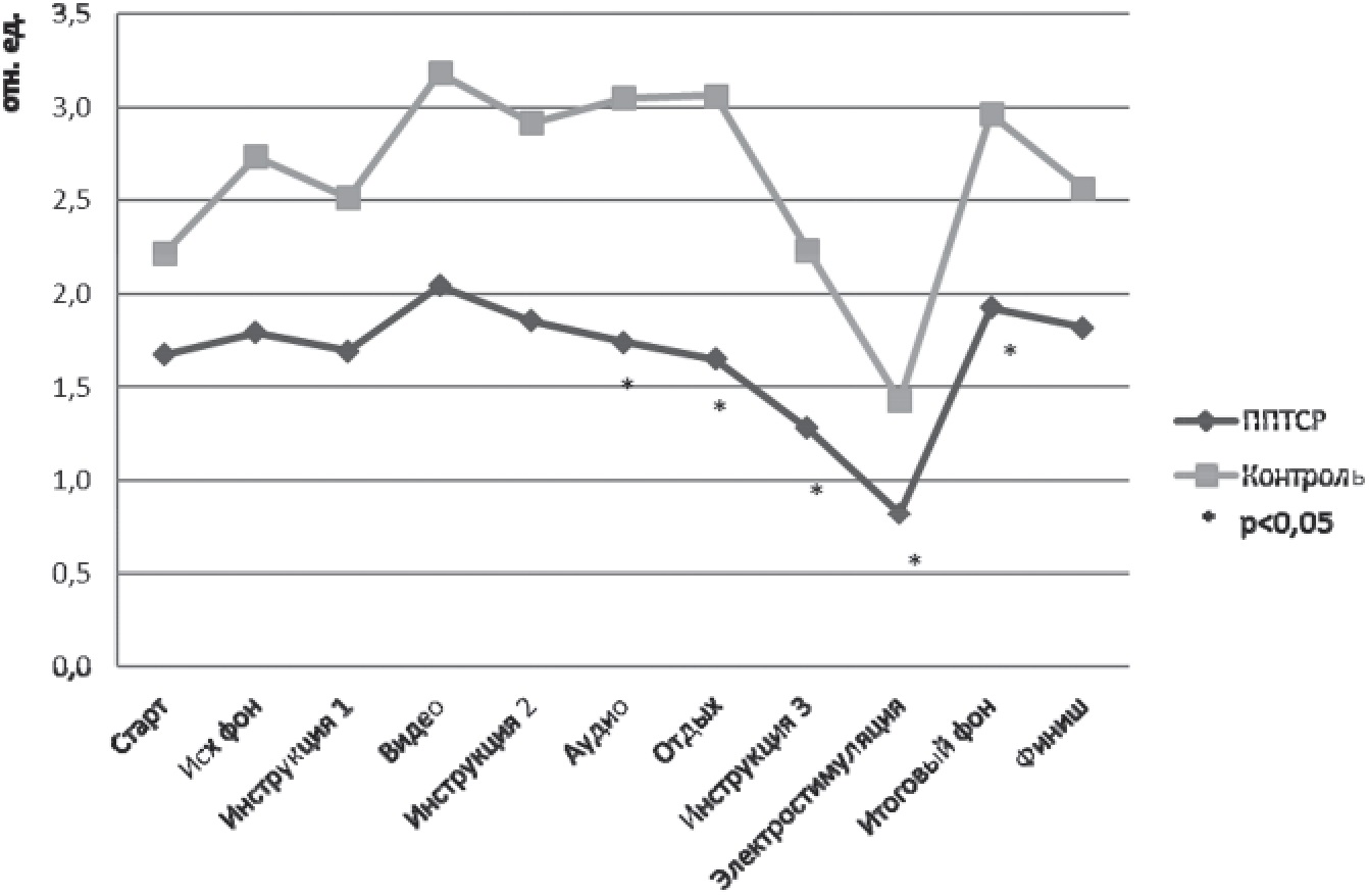Результаты и их обсуждение. По результатам кластерного анализа методом k-means данных МШ обследуемые были разделены на две группы с достоверно различающимися центрами кластеров: 56,94 баллов – 16 человек и 40,3 баллов – 24 человека, p<0,000. Таким образом, группа с признаками ППТСР составила 40% от всех обследуемых. Остальные военнослужащие были отнесены в контрольную группу (КГ). Сравнение групп по ЭО не выявило значимого различия ни по одному из оцениваемых аспектов профессиональной деятельности. Отсутствие различий в качестве профессиональной деятельности подтвердили и результаты по методике «Оператор». Показатель СР составил 8,65 и 8,84 у. е. (p>0,05), показатель ВС 8,8 и 8,9 у. е. (p>0,05), а ИПЭУ – 8,27 и 8,87 у. е (p>0,05), что соответствует высокому уровню эмоциональной устойчивости. Таким образом, полученные данные свидетельствуют о том, что наличие признаков ППТСР не сказывается на профессиональной деятельности военнослужащих. Кроме того, ни один из исследуемых показателей (ЧСС, ДАС, РД, КГР) на АПК «Реакор» не имел групповых отличий за исключением АСВ, которая начиная с этапа аудиостимуляции была статистически значимо ниже в группе с признаками ППТСР (табл. 1).