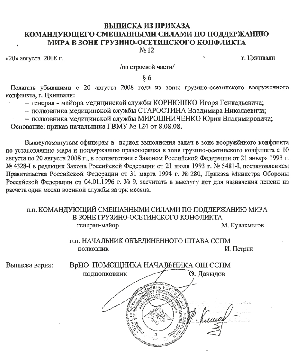 Рис. 4. Выписка из приказа командующего ССПМ об убытии из зоны боевых действий офицеров оперативной группы ГВМУ МО РФ (20 августа 2008 г.)
