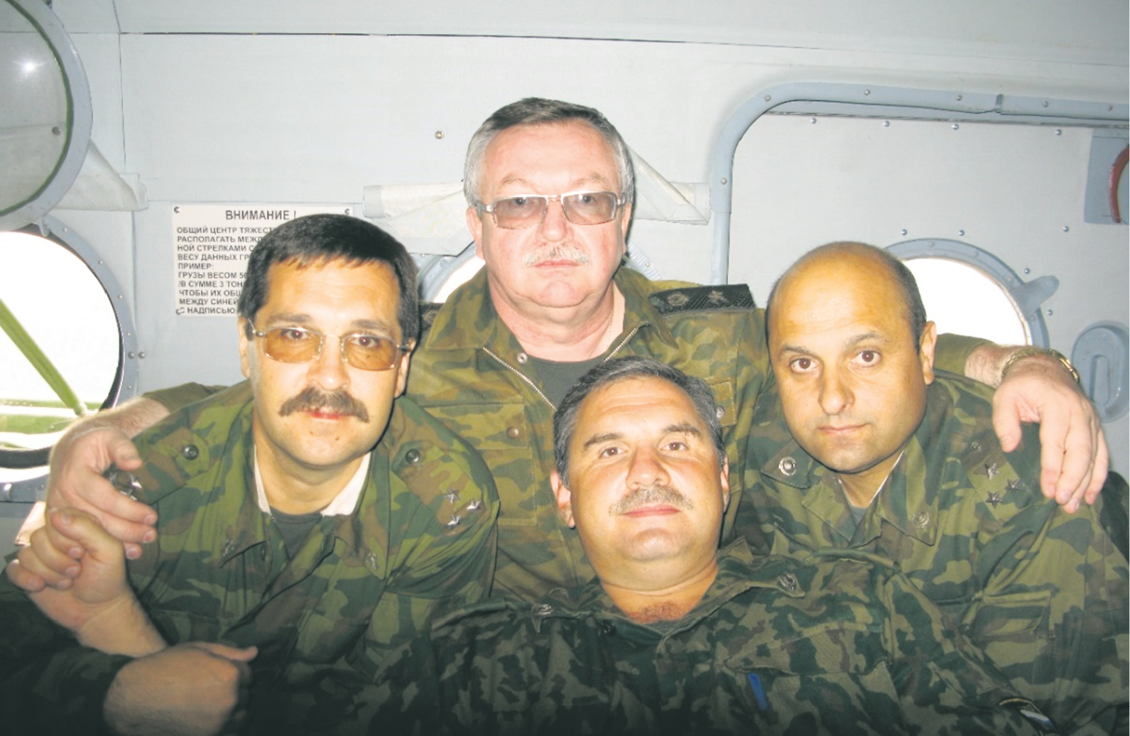 Рис. 5. Ю.В. Мирошниченко, И.Г. Корнюшко, Ф.М. Беня и В.В. Бояринцев на борту вертолета во время возвращения из зоны боевых действий (20 августа 2008 г.)