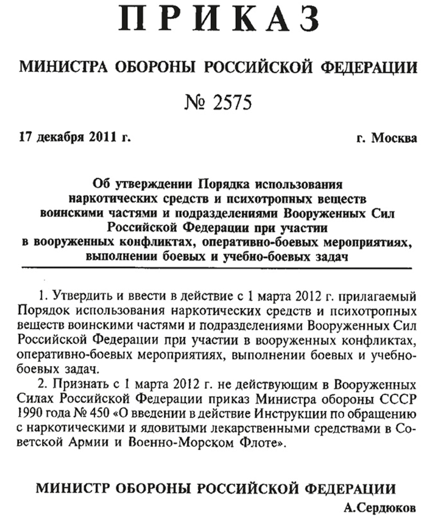2 Приказ МО РФ от 17 декабря 2011 г. № 2575 «Об утверждении Порядка использования наркотических средств и психотропных веществ воинскими частями и подразделениями ВС РФ при участии в вооруженных конфликтах, оперативно-боевых мероприятиях, выполнении боевых и учебно-боевых задач».