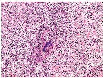 Рис. 1. Метастатический гнойник в почке. Видна колония бактерий в просвете сосуда с некрозом его стенки, крупный очаг нейтрофильных гранулоцитов, окраска гематоксилином и эозином, ув. ×200