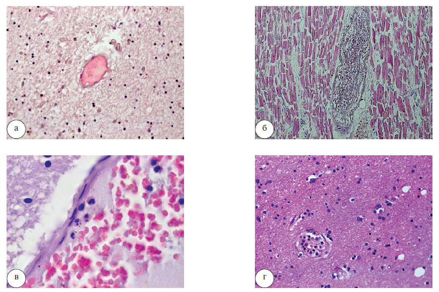 Рис. 3. Гистологические признаки поражения микроциркуляторного русла: а – в головном мозге: сладж-феномен, ув. ×40; б – в миокарде: слущенные эндотелиоциты в просвете сосуда, ув. ×200; в – в головном мозге: краевое стояние и адгезия нейтрофилов, ув. ×1000; г – в головном мозге: фибриноидный некроз стенки сосуда, лейкостаз, ув. ×200. Окраска гематоксилином и эозином