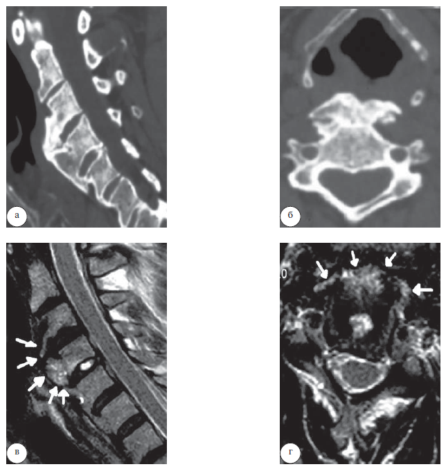 Рис. 1. Предоперационные данные КТ (а, б) и МРТ (в, г) шейного отдела позвоночника. Гиперостоз передней продольной связки на уровне СIII, CIV и СV позвонков (указан стрелками)