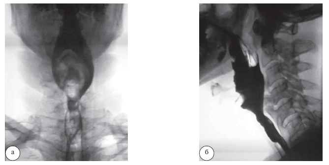 Рис. 2. Рентгеноскопия глотки и пищевода с барием в боковой (а) и прямой (б) проекциях. Задержка прохождения контрастного вещества на уровне CIV и СV позвонков
