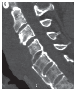 Под общей многокомпонентной интубационной анестезией выполнено микрохирургическое удаление очагов гиперостоза CIII и СIV позвонков и декомпрессия гортани и глотки передним доступом. Длительность операции составила 85 мин, кровопотеря – менее10 мл. Послеоперационный период протекал без осложнений. Дисфагия и дисфония полностью регрессировали через 8 дней после операции. Сохранялась эпизодическая умеренная ноющая боль в области операции. Пациент неоднократно посещал контрольные осмотры вплоть до 2010 г. Отмечалась положительная динамика, и до 2018 г. болезнь не беспокоила пациента. В конце 2018 г. пациент отметил возобновление болевого синдрома в шее и осиплости голоса. Больной был проконсультирован оперировавшим нейрохирургом, который диагностировал рецидив болезни Форестье на ранее оперированном уровне. Диагноз был подтвержден данными КТ и МРТ шейного отдела позвоночника – максимальная выраженность гиперостоза была на уровне СIII–CV позвонков (рис. 1).