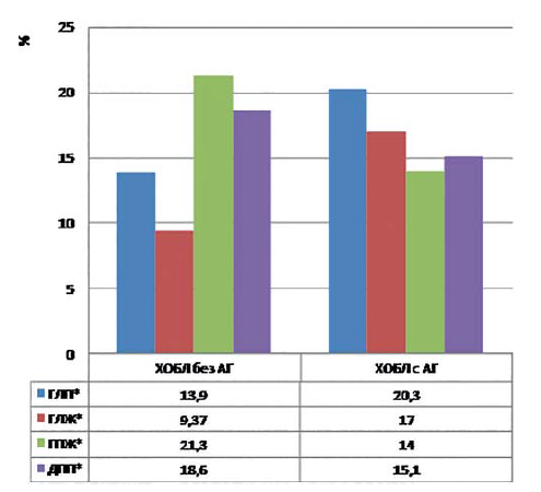 У пациентов, страдающих ХОБЛ и АГ, частота ГПЖ была больше, чем при отсутствии АГ. Из рисунков 3 и 4 видно, что при ХОБЛ без АГ ремоделированию подвергаются не только правые отделы сердца, но и левые, а у пациента с наличием АГ частота ДДПЖ значительно больше, чем при отсутствии АГ.