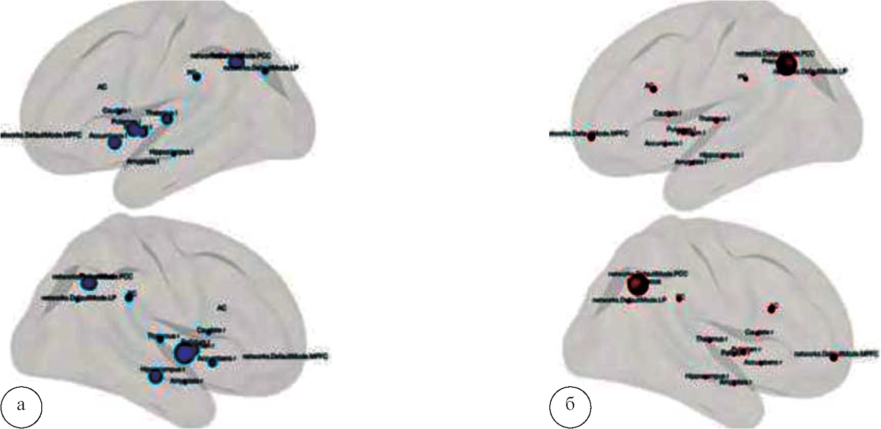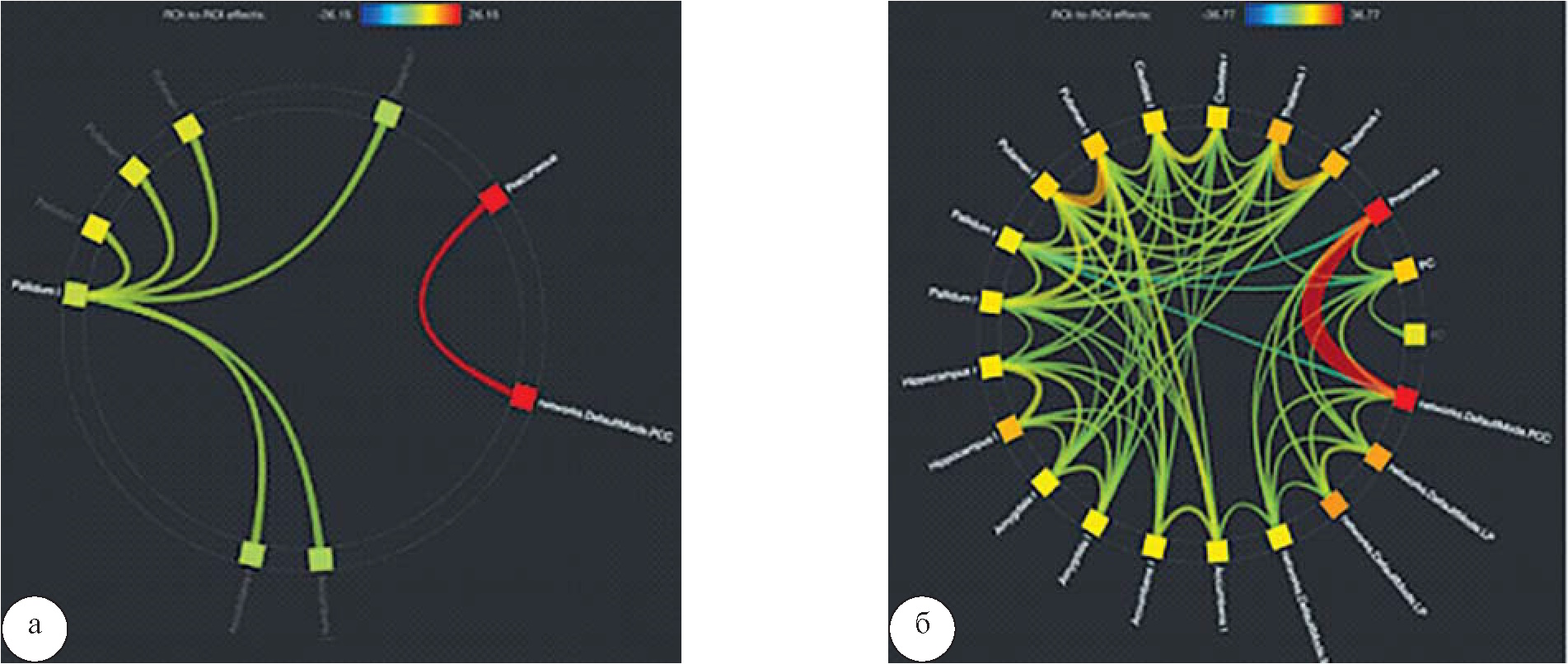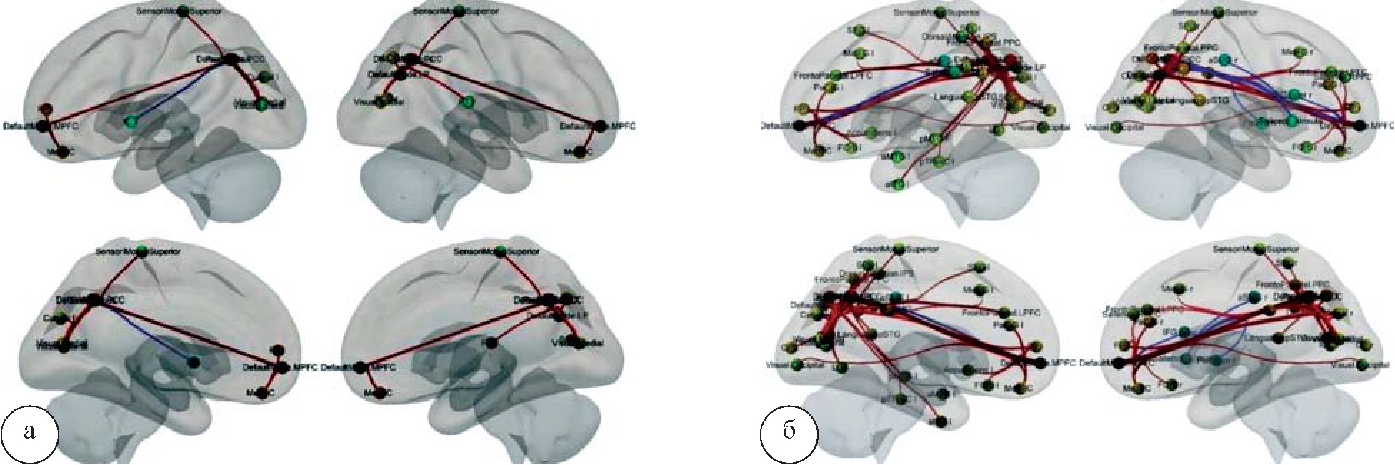 Рис. 1. Функциональные связи СПРР: а – в группе пациентов, находящихся в состоянии короткой ремиссии; б – картина нормальной коннективности, p<0,05