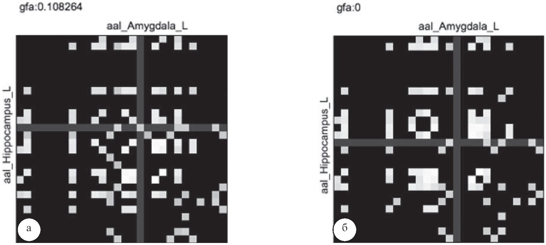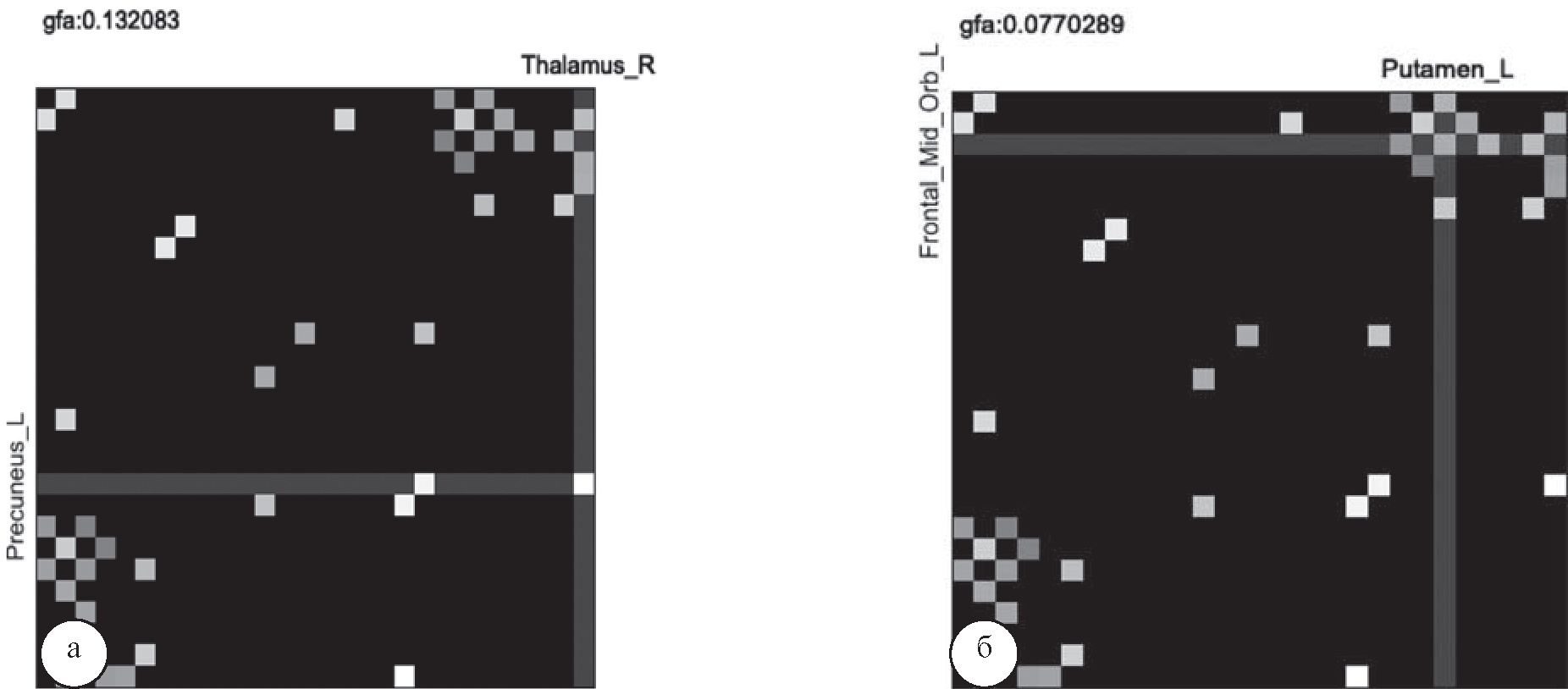 Рис. 4. Матрицы микроструктурной коннективности по данным трактографии: а – патологический конгломерат связности подкорковых структур при синдроме зависимости от алкоголя; б – в норме, p<0,05