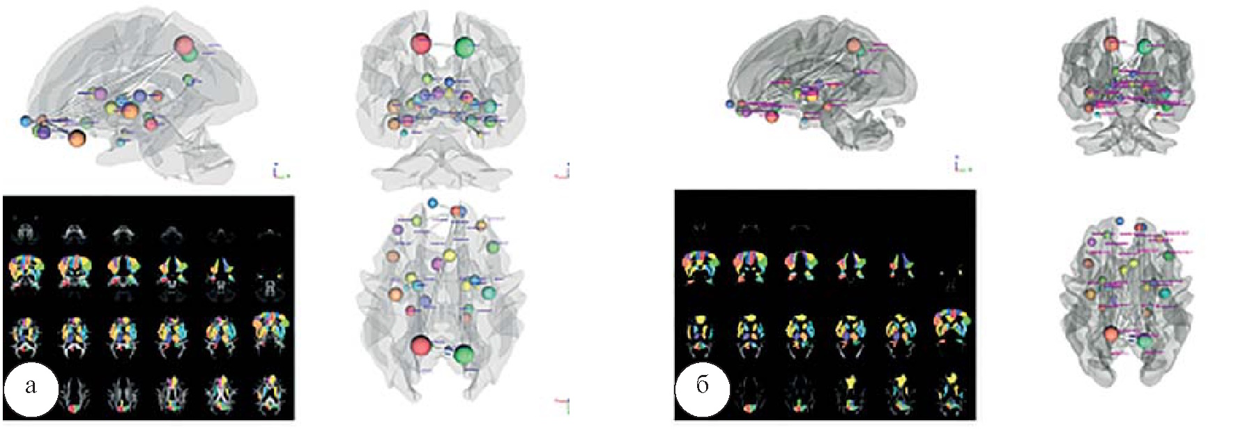 Рис. 3. Функциональные коннектомы: а – при синдроме зависимости от алкоголя; б – в норме, p<0,05