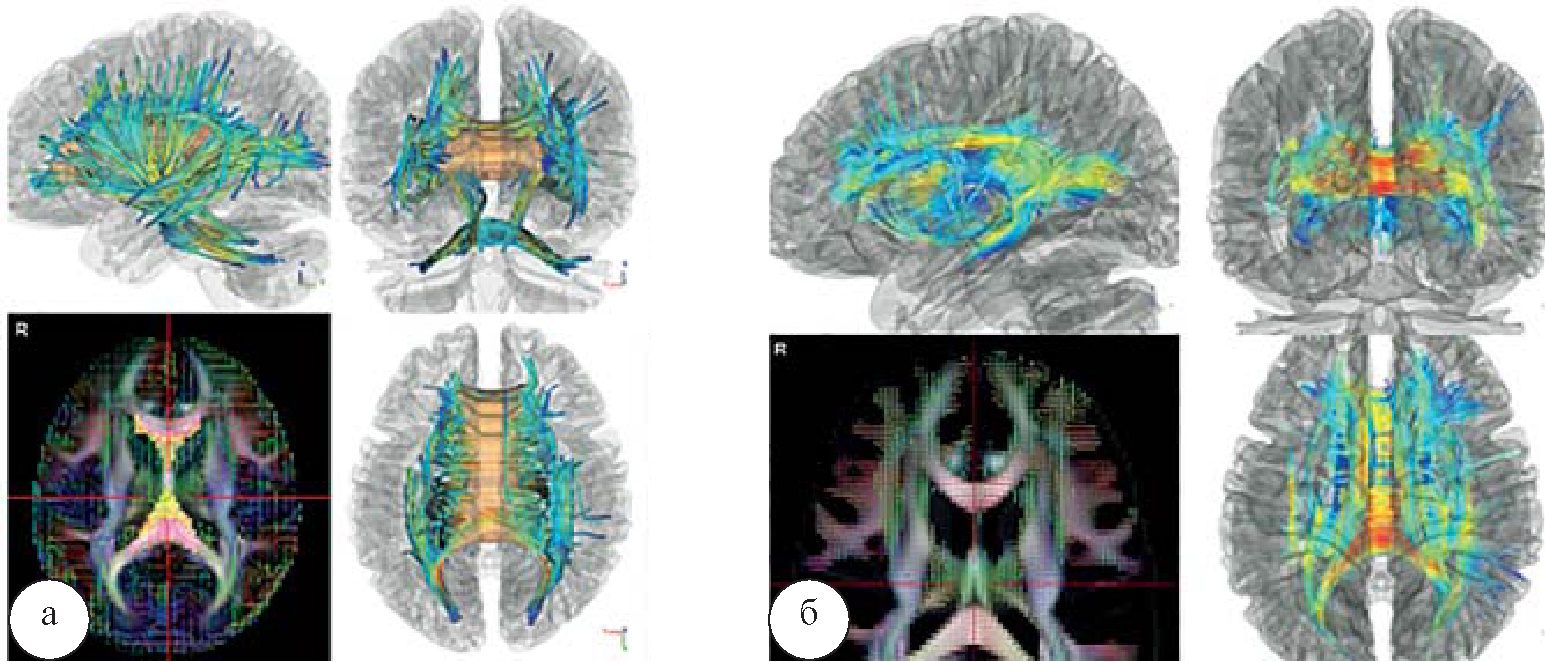 Рис. 7. Особенности микроструктурной организации между полушариями головного мозга: а – при синдроме зависимости от опиоидов; б – у больных, страдающих алкоголизмом, p<0,05. О снижении GFA свидетельствуют холодные цвета, о повышении – теплые