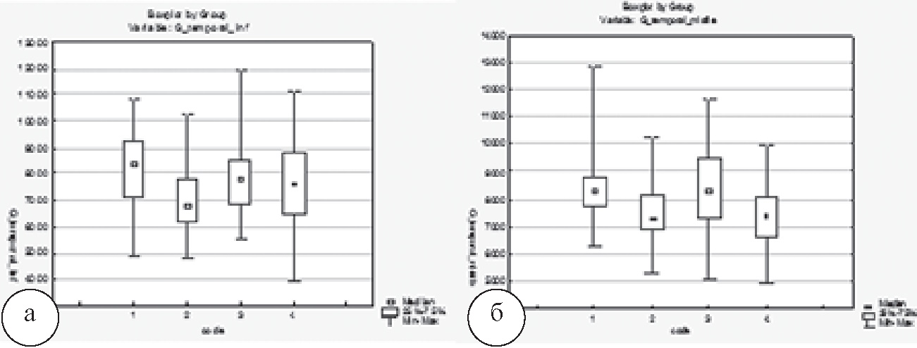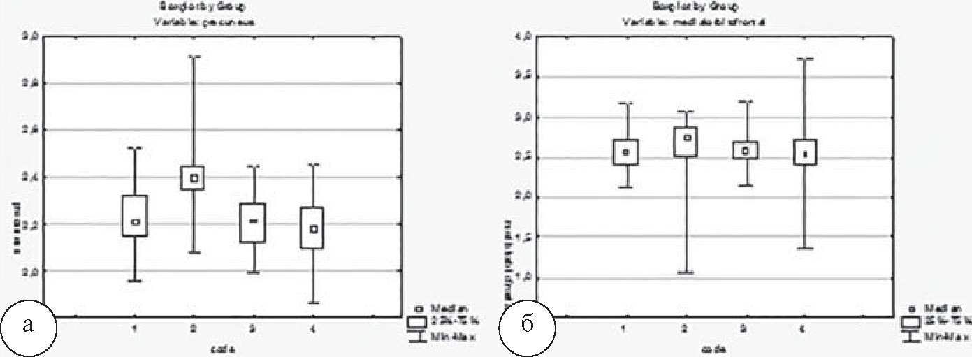 Рис. 8. Особенности изменения толщины коры по данным морфометрии: а – в нижней височной извилине; б – в средней височной борозде. 1 – здоровые, 2 – наркозависимые, находящиеся в состоянии короткой ремиссии, 3 – наркозависимые, находящиеся в состоянии ремиссии более двух лет, 4 – пациенты, страдающие синдромом зависимости от алкоголя