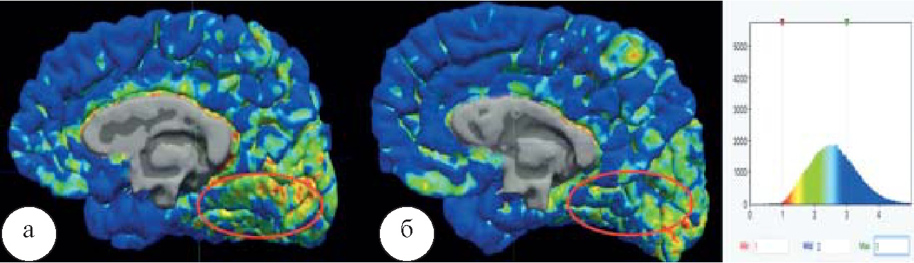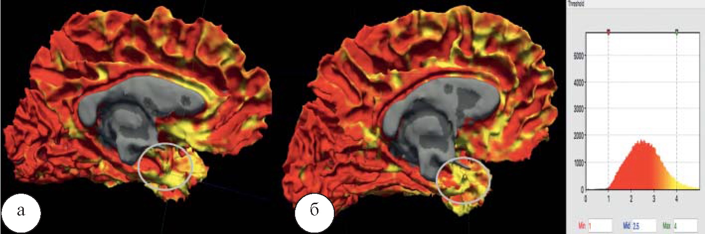 Рис. 9. Особенности изменения толщины коры в веретенообразной извилине справа по данным морфометрии: а – наркозависимые, б – норма