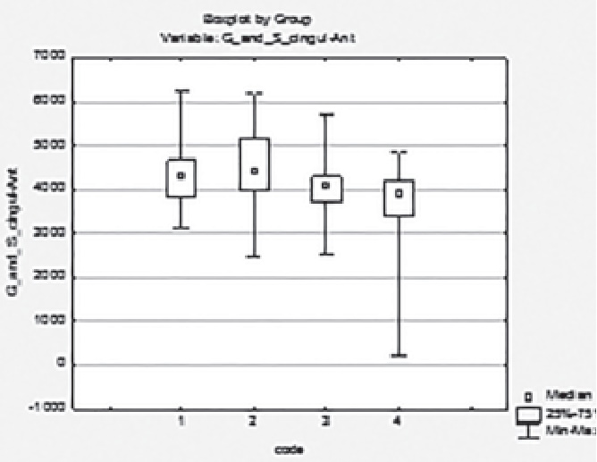 Рис. 12. Динамика изменений толщины коры переднего отдела поясной извилины в группах сравнения: 1 – здоровые, 2 – наркозависимые, находящиеся в состоянии короткой ремиссии, 3 – наркозависимые, находящиеся в состоянии ремиссии более двух лет, 4 – пациенты, страдающие синдромом зависимости от алкоголя