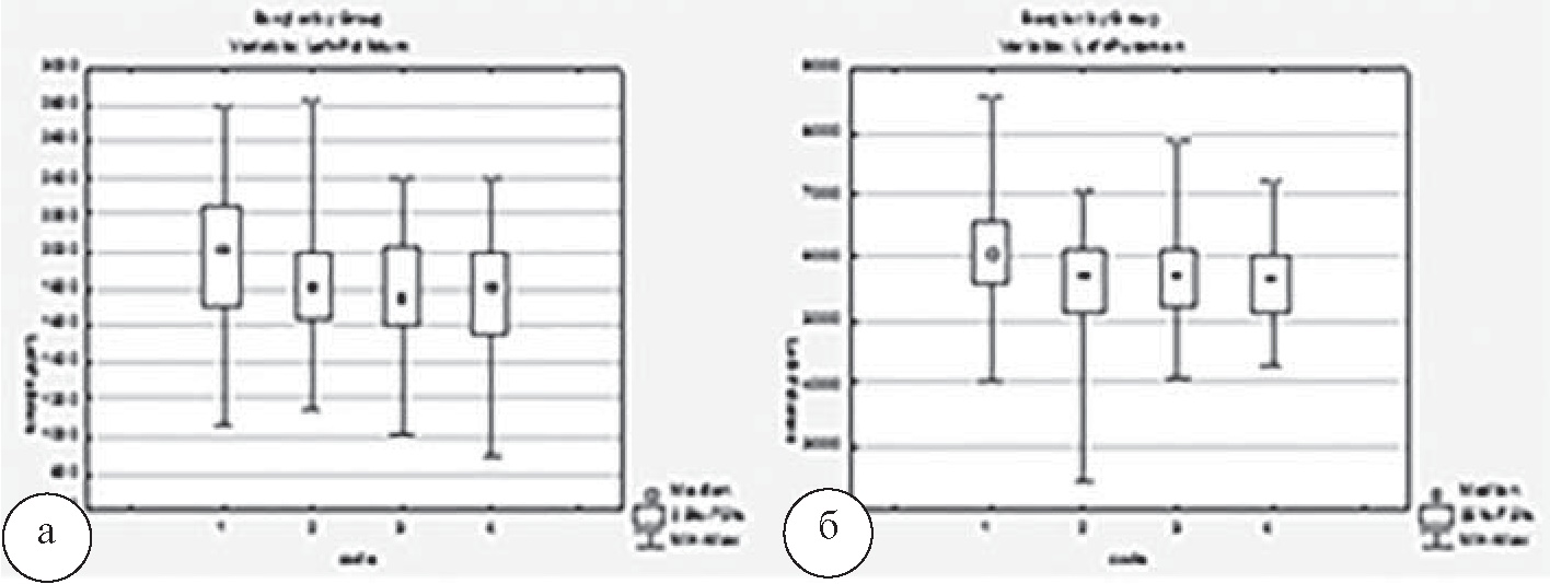 Рис. 13. Патологические изменения подкорковых структур в группах сравнения: а – бледного шара; б – скорлупы. 1 – здоровые, 2 – наркозависимые, находящиеся в состоянии короткой ремиссии, 3 – наркозависимые, находящиеся в состоянии ремиссии более двух лет, 4 – пациенты, страдающие синдромом зависимости от алкоголя