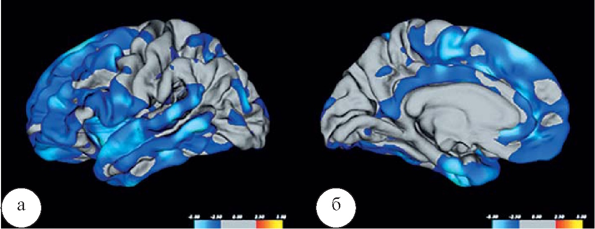 Рис. 14. Графическое представление толщины коры от длительности стажа употребления опиоидов в левом полушарии головного мозга: а – наружная поверхность головного мозга; б – медиальная поверхность. Синим цветом обозначено уменьшение толщины коры в описываемых структурах