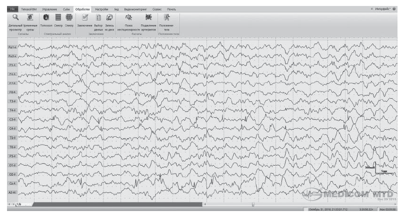 Рис. 3. Эпилептиформные нарушения в виде умеренно амплитудных комплексов «пик-медленная волна» в заднелобных отведениях с выраженной правосторонней латерализацией без группирования и генерализации