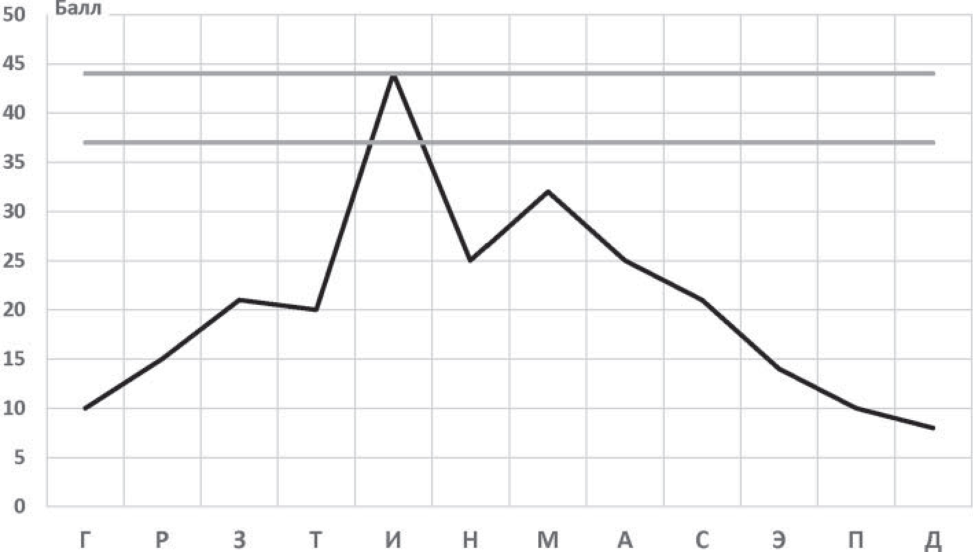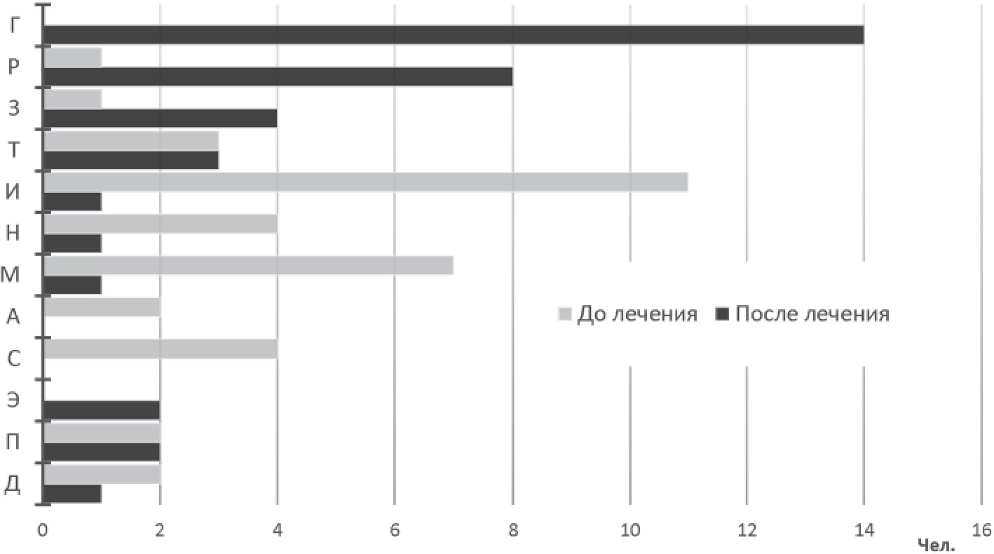 Для определения типа отношения пациента к болезни была использована клиническая методика «Тип отношения к болезни» (ТОБОЛ), в которой реализовалась клинико-психологическая типология отношения пациента к болезни, предложенная А.Е. Личко и Н.Я. Ивановым в 1980 г. [9]. Методика предусматривает возможность определения одного из двенадцати типов реагирования: сенситивный (С), тревожный (Т), ипохондрический (И), меланхолический (М), апатический (А), неврастенический (Н), эгоцентрический (Э), паранойяльный (П), анозогнозический (З), дисфорический (Д), эргопатический (Р) и гармоничный (Г), которые выделены в 3 блока: условно-адаптивный (I), интрапсихически-дезадаптивный (II) и интерпсихически-дезадаптивный (III) [7]. Тип отношения к болезни определяли дважды: до и после лечения.