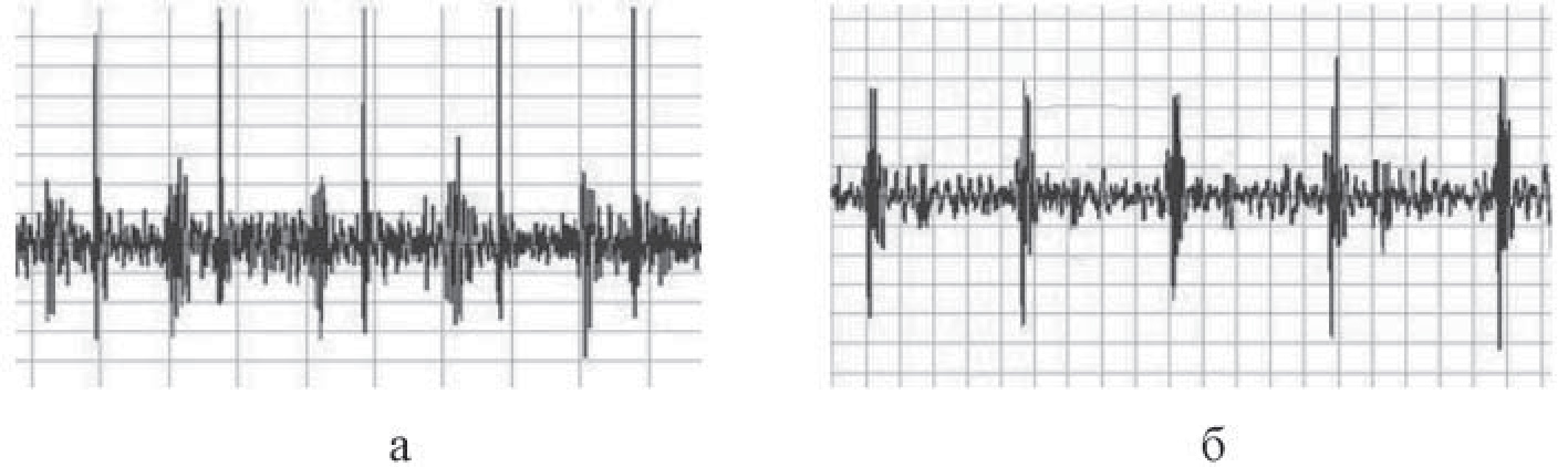 Рис. 4. Фонограмма ВНЧС при движении нижней челюсти пациента С. 39 лет: а – до лечения; б – после лечения