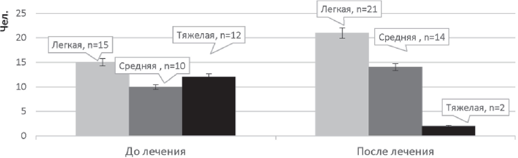 Рис. 6. Степень тяжести течения заболеваний ВНЧС до и после завершения лечения