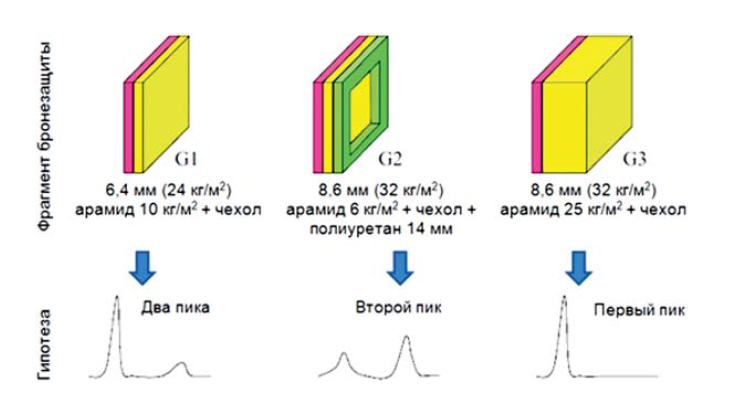 Данная серия испытаний была разработана для того, чтобы выяснить истинную причину заброневого ранения груди, отделив влияние первичного высокочастотного и краткосрочного пика давления ударной волны (УВ) от воздействия вторичного пикового давления перемещения (сжатия), предположительно вызванного деформацией тыльной поверхности бронежилета. Теоретически первый фрагмент брони (типичный бронежилет) при обстреле должен был вызывать воздействие в виде крутого первого пика давления и более пологого продолжительного второго пика давления перемещения (G1). Второй образец брони должен был иметь только второй пик давления(G2), а третий должен иметь только первый пик (G3).