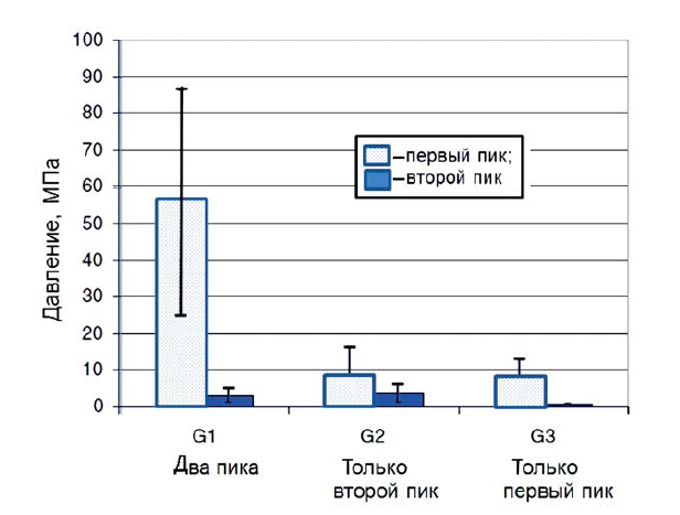 Рис. 2. Средние значения первого и второго пикового давления для каждого из трёх фрагментов брони G1, G2, G3 [12]