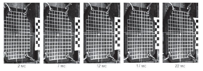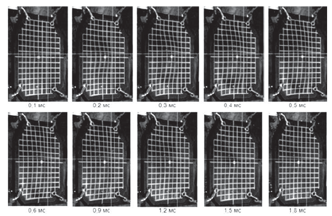 Последующее за «ударом выступа» перемещение всей керамической бронепанели в пространстве в направлении удара наблюдалось в период времени от 2 до 22 мс от момента удара пули по бронепанели (рис. 4).