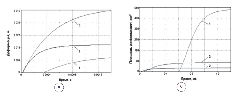 Рис. 5. Параметры формирования запреградного выступа во времени: а – кривые деформации; б – кривые площади деформации. 1 – нарастание запреградного выступа при непробитии керамической бронепанели; 2 – нарастание запреградного выступа при непробитии бронешлема, усиленного стальной пластиной, выстрел из 9-мм пистолета Макарова (ПМ) в лоб; 3 – нарастание запреградного выступа при непробитии арамиднокомпозитного бронешлема, выстрел из ПМ в лоб