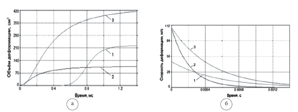 Рис. 6. Параметры формирования запреградного выступа во времени: а – кривые объёма; б – кривые скорости деформации. 1 – нарастание запреградного выступа при непробитии керамической бронепанели; 2 – нарастание запреградного выступа при непробитии бронешлема, усиленного стальной пластиной, выстрел из ПМ в лоб; 3 – нарастание запреградного выступа при непробитии арамиднокомпозитного бронешлема, выстрел из ПМ в лоб