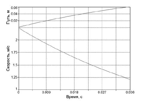 Рис. 7. Перемещение и скорость керамической бронепанели в направлении выстрела из СВД при условии её непробития