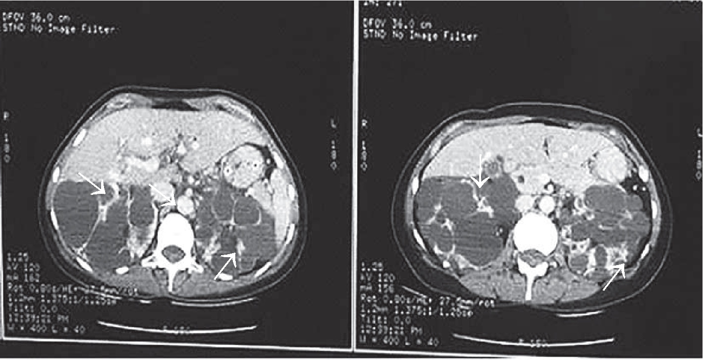 С учетом диагностированного поликистоза, прогрессирования острого почечного повреждения в виде гиперазотемии и необходимости проведения рентген- контрастного исследования (РКИ) – КТ-ангиографии – пациентка была консультирована нефрологом. Заключение: абсолютных противопоказаний для РКИ нет, рекомендована подготовка к исследованию – достижение нормоволемии, поддержание темпа диуреза 70–150 мл/ч, после исследования поддержание нормоволемии и темпа диуреза 70–150 мл/ч. Использовать рентген-контрастный препарат III ил IV поколения (ультравист).