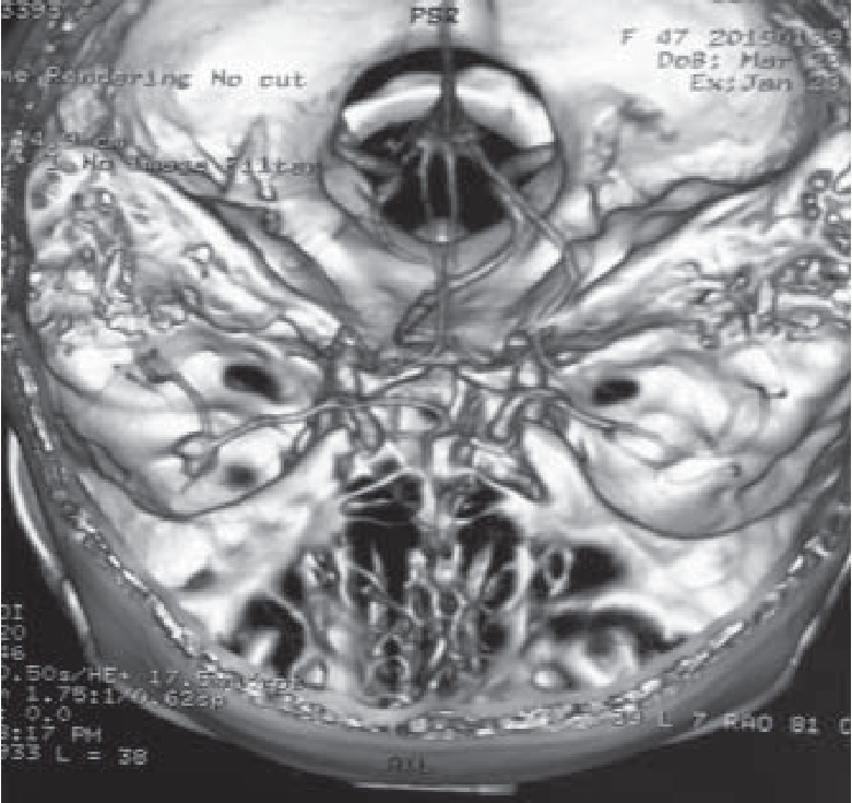 Рис. 4. КТ-картина мешотчатой аневризмы правой срединной мозговой артерии