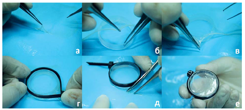 Рис. 2. Этапы фиксации АМ согласно патенту № RU 2680471. а, б, в – нативная АМ в расправленном состоянии укладывается на гладкие края стерильной чашки Петри диаметром 3 см со срезанным дном; г – АМ механически фиксируется при помощи стерильного зажимного хомута; д – нефиксированной части АМ отсекается; е – вид фиксированной АМ