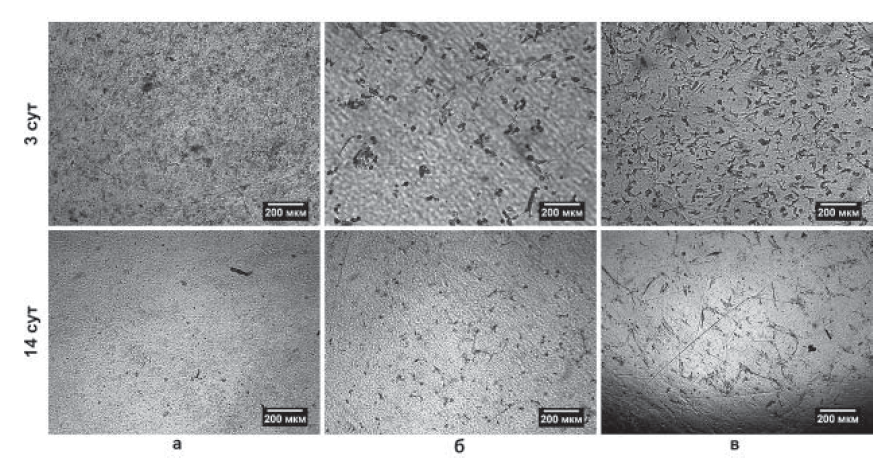 На 14-е сутки во второй группе наблюдались лишь единичные распластанные клетки. В третьей группе клеток мало, они распластаны хуже, чем на 3-и сутки культивирования, их морфология свидетельствует об угнетенном состоянии.