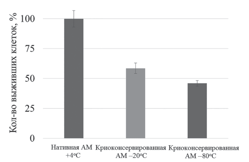 Выявлено, что наименьшее количество выживших клеток АМ наблюдается в скаффолдах криоконсервированных при –80°С (рис. 4).