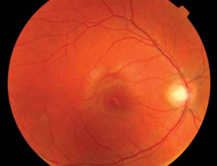 Рис. 3. Глазное дно пациента через 6 месяцев после поражения лазерным излучением (лазерной указкой). В центре фовеа определяется округлый дефект сетчатки, острота зрения – 0,1