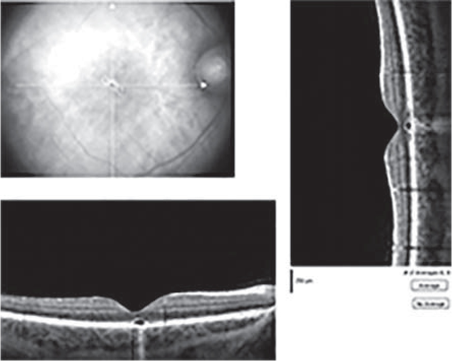 Исследование центрального поля зрения выявило абсолютную центральную скотому, которая при офтальмоскопии сопровождалось визуализацией точечного участка белесоватого цвета в макулярной области левого глаза (рис. 3), а СЛО и ОКТ позволили обнаружить в этом же месте разрыв шириной до 400 мкм с утолщенными (более 400 мкм) и кистозноизмененными краями (рис. 4).