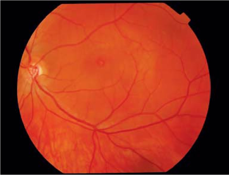 Рис. 1. Глазное дно пациента через 3 месяца после поражения лазерным излучением (лазерной указкой). В парафовеолярной области определяются точечные пигментные включения, острота зрения – 0,6