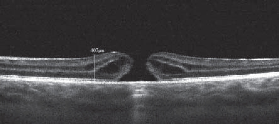 Рис. 4. Изображение результатов оптической когерентной томографии пациента через 6 месяцев после поражения лазерным излучением (лазерной указкой). В центре фовеа определяется разрыв сетчатки с приподнятыми отечными краями