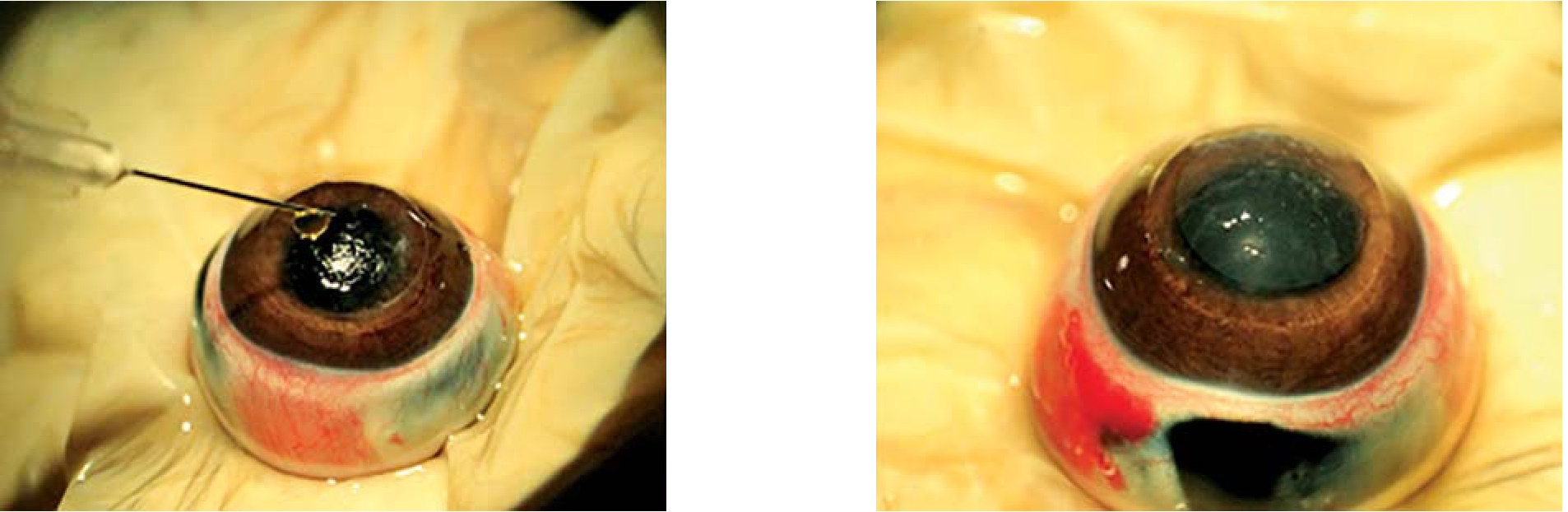 Апробация клея проведена на глазах трех кроликов (6 глазах) породы шиншилла посредством вклейки амниотической мембраны (АМ) после поверхностной кератэктомии (рис. 1). Заранее проводилась заготовка компонентов ФК. Трепаном на дозированную глубину в 100–150 мкм выполнялась поверхностная кератэктомия. На строму роговицы наносилась половина объемов компонентов, смешанных в одном шприце. Сразу после этого выкраивалась АМ необходимого диаметра и накладывалась на строму роговицы. Проводилась экспозиция в течение 1 мин. Далее на роговичную поверхность наносились смешанные в одном шприце остаточные объемы компонентов полученного двухкомпонентного ФК.