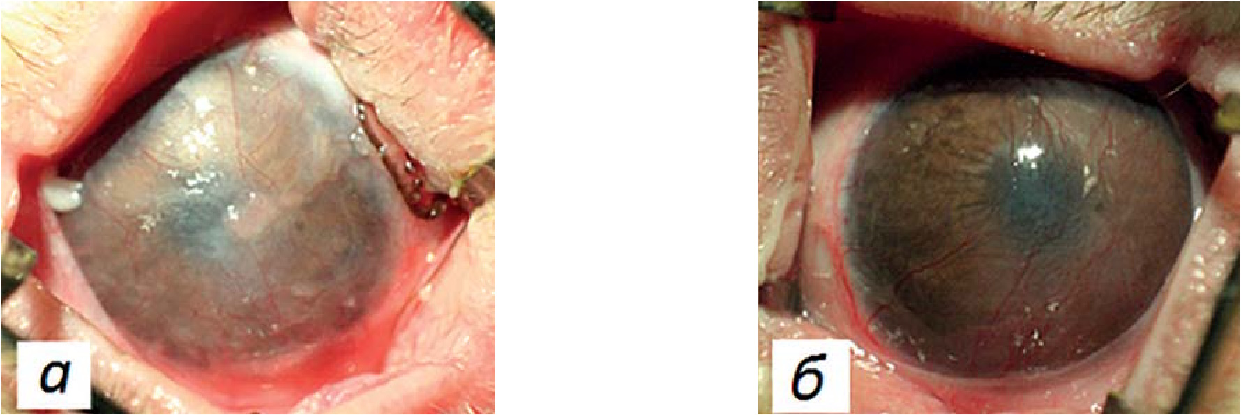 Рис. 2. Фоторегистрация прозрачности роговицы на 90-е сутки: а – группа А; б – группа Б