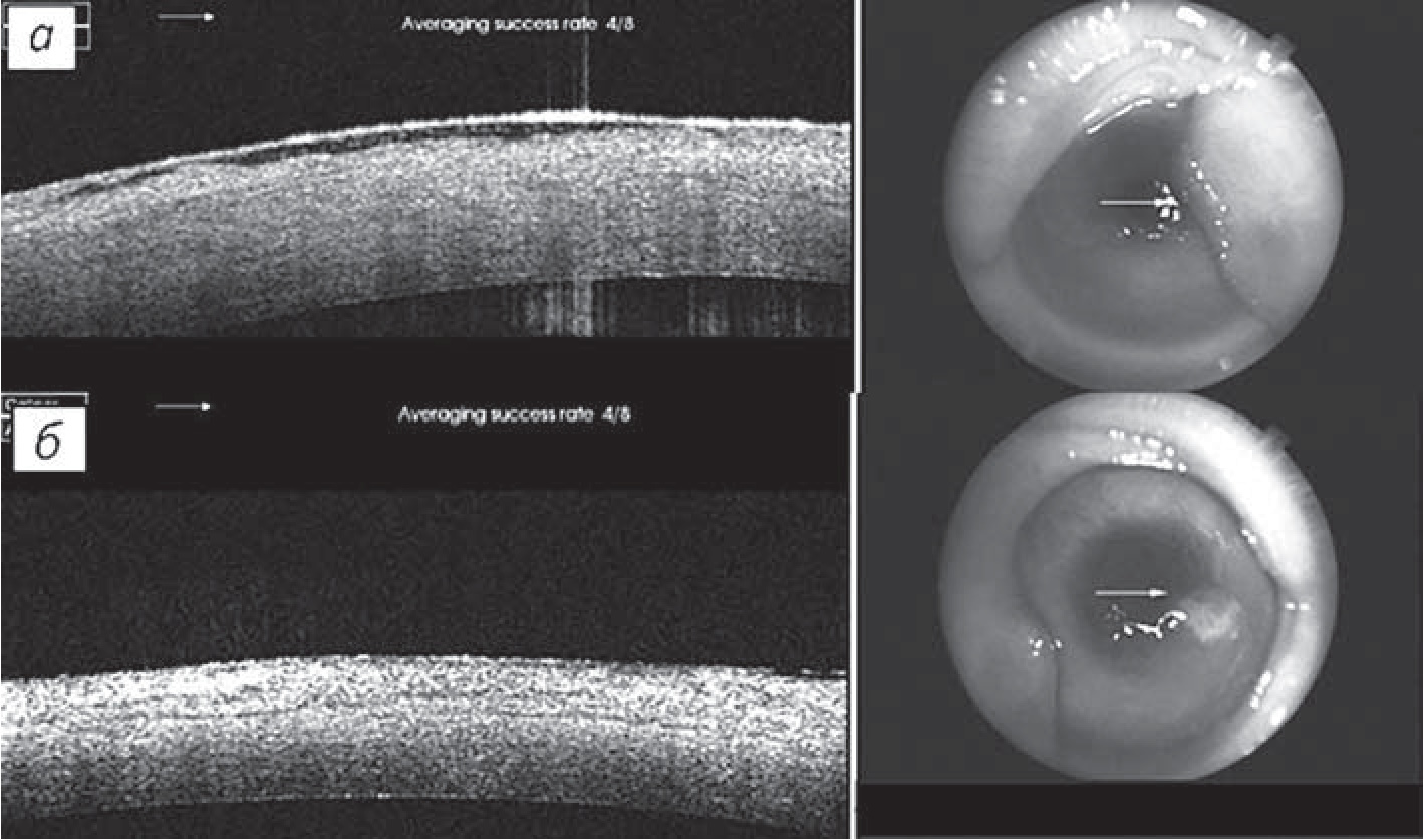 По данным сравнительной оптической когерентной томографии (рис. 3) выявлено, что в группе А эпителий в центральных отделах неадгезирован, визуализируются субэпителиальные кисты, АМ присутствует только в параоптической области и постепенно истончается до полного исчезновения в оптической зоне. В группе Б АМ интегрирована на всем протяжении, эпителий полностью адгезирован, субэпителиальные кисты отсутствуют.