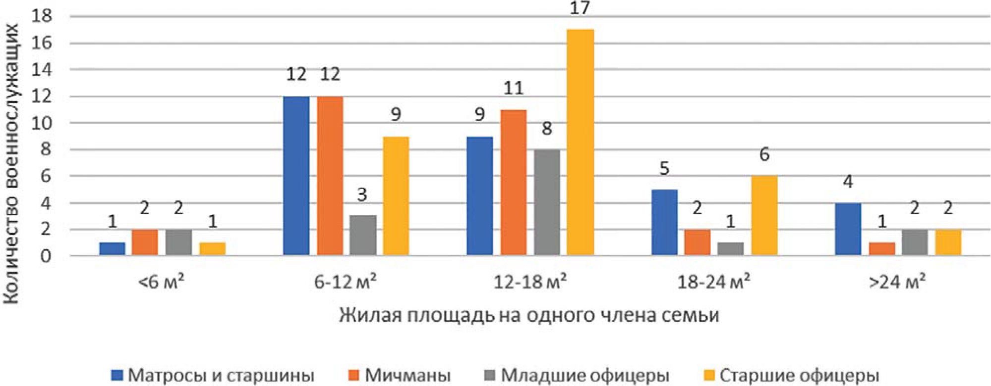 Результаты и их обсуждение. Установлено, что общая оценка КЖ у матросов и старшин составила 91,8 балла (95% ДИ: 87,9–95,8), у мичманов – 92,6 балла (95% ДИ: 89,2–95,9), у младших офицеров – 99,5 балла (95% ДИ: 95,2–103,8) и старших офицеров – 95,1 балла (95% ДИ: 91,4–98,8). В среднем общая оценка КЖ составила 72,5% от максимально возможной (64% в 2005 г.). Выявлено, что на одного члена семьи 83 (75,5%) военнослужащих имели доход более 30 тысяч рублей в месяц, 22 (20%) опрошенных получали от 20 до 30 тысяч рублей, 4 (3,6%) оценили свой доход в размере от 12 до 20 тысяч рублей и у одного (0,9%) военнослужащего средний доход составил менее 12 тысяч рублей.