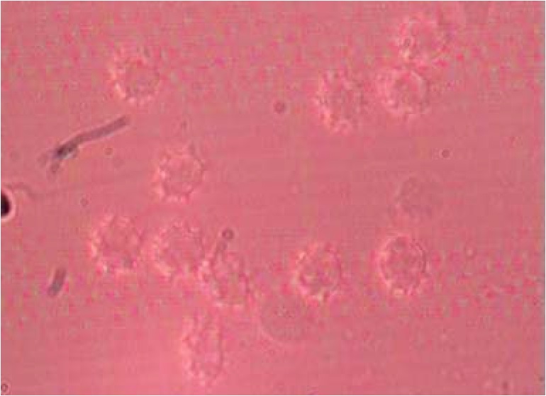Рис. 1. Микрофотография крупноворсистых эритроцитов человека in vivo, венозная кровь, ув. ×40, масштаб 10 мкм